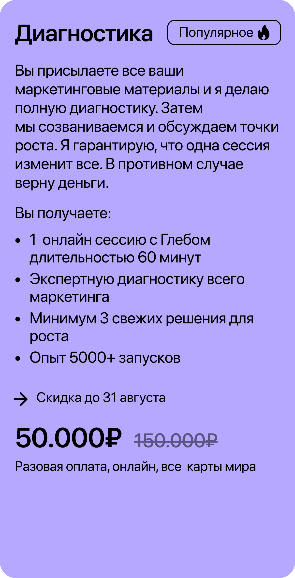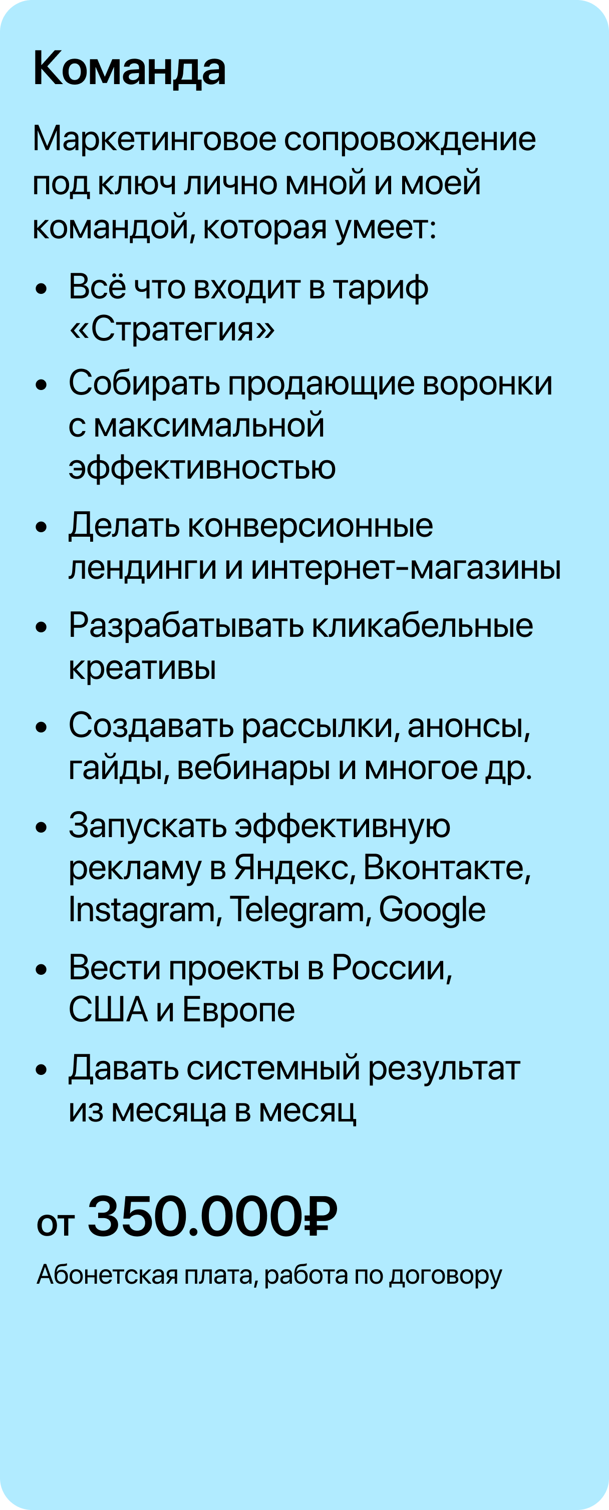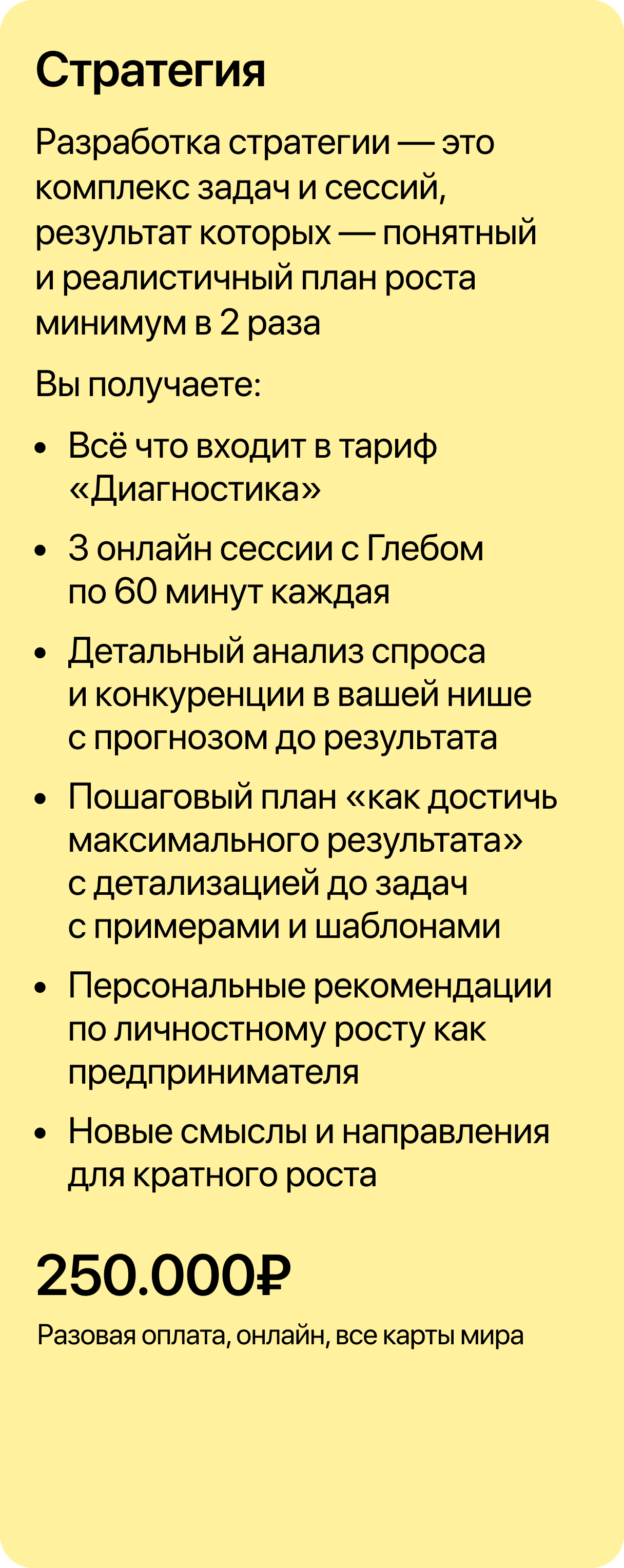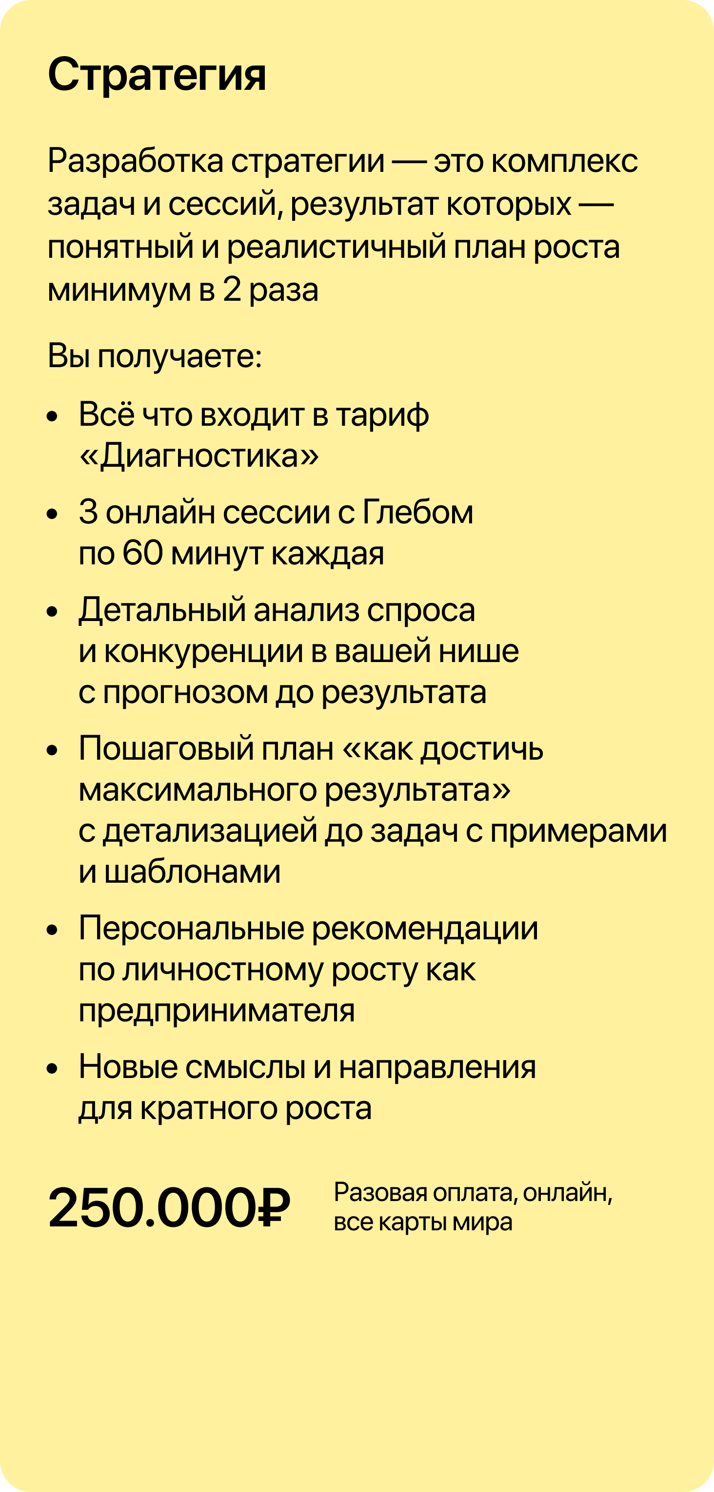 В моей работе, главный ты. Я не даю шаблонных советов. Каждое слово и ситуация подбирается именно под тебя и твой бизнес. Весь реальный рост заложен только внутри тебя.