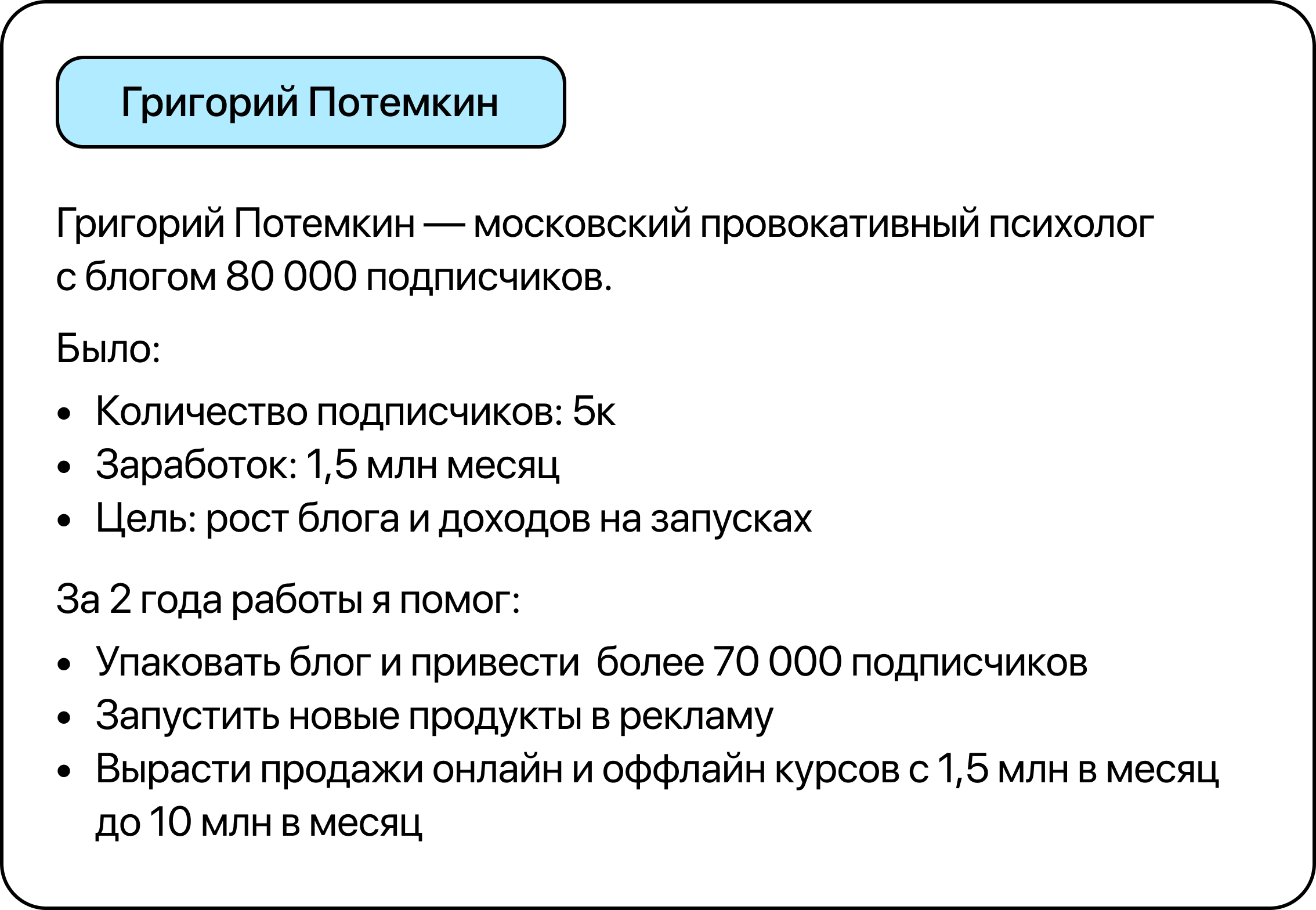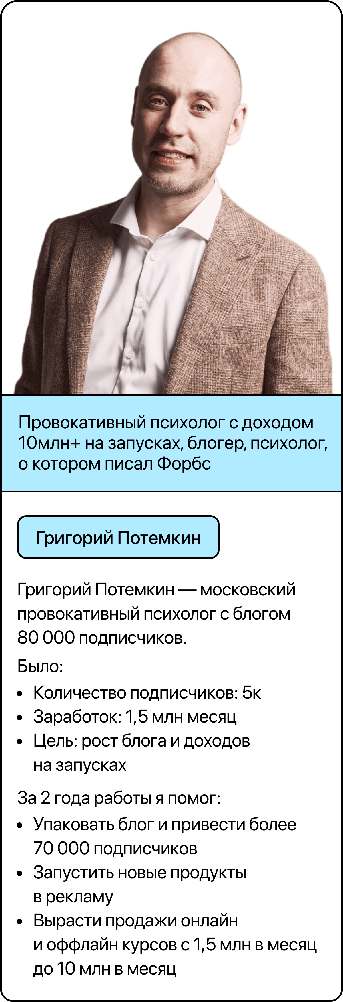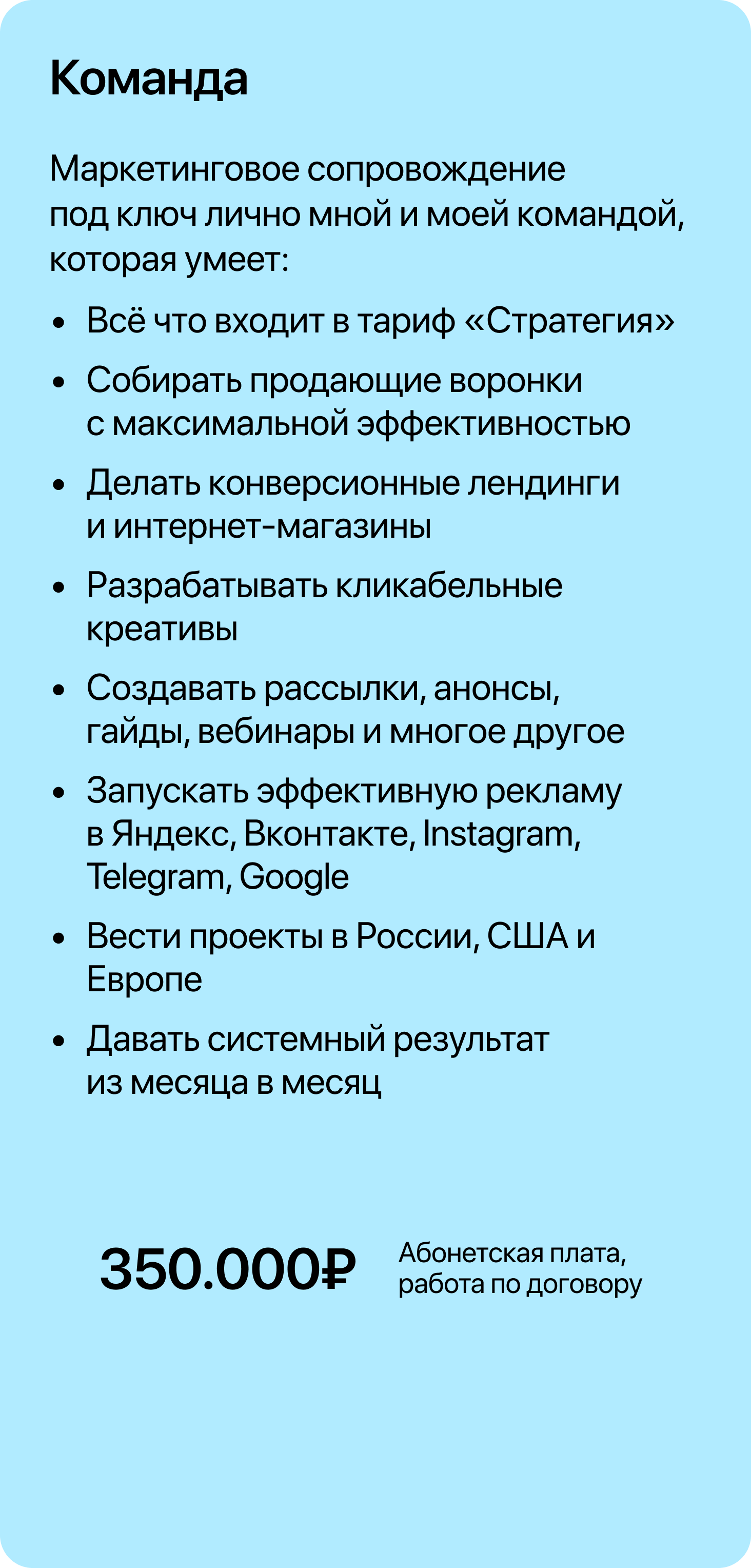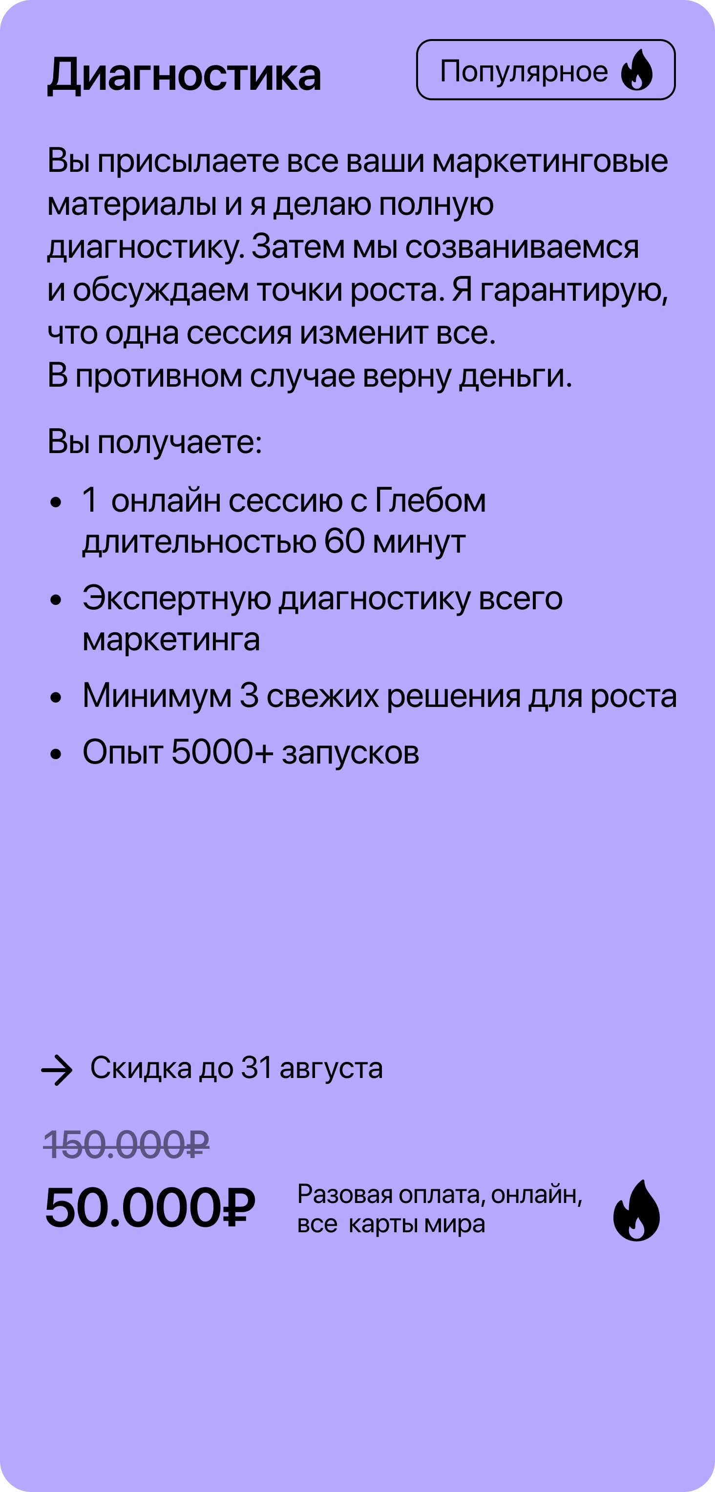 В моей работе, главный ты. Я не даю шаблонных советов. Каждое слово и ситуация подбирается именно под тебя и твой бизнес. Весь реальный рост заложен только внутри тебя.